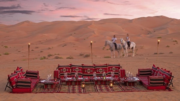 Despite its remote location, there’s plenty to do in and around the hotel. Begin the day with a sunrise yoga class and while away an afternoon by the palm-lined infinity pool or visit the pampering Anantara Spa for an Arabian massage followed by a rejuvenating stint in the Jacuzzi, sauna or hammam. Explore the resort’s incredible natural surroundings with a host of exhilarating immersive experiences including dune-bashing, camel treks and guided night walks through the desert. For active types, there’s also a floodlit tennis court, state-of-the-art fitness centre and yoga studio – plus a kids’ club to keep younger guests entertained.