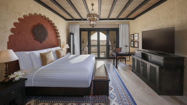 The 196 rooms and suites are elegantly designed in a style that blends Arabic-style lanterns and rugs with luxurious modern touches like Nespresso machines, large round bathtubs and pillow and soap menus. All have a private balcony or terrace with beautiful desert views. Perfect for larger families or groups of friends, Three-Bedroom Pool Villas sit at the desert’s edge with unrivalled views and come with butler service, indoor-outdoor living and private plunge pools.
