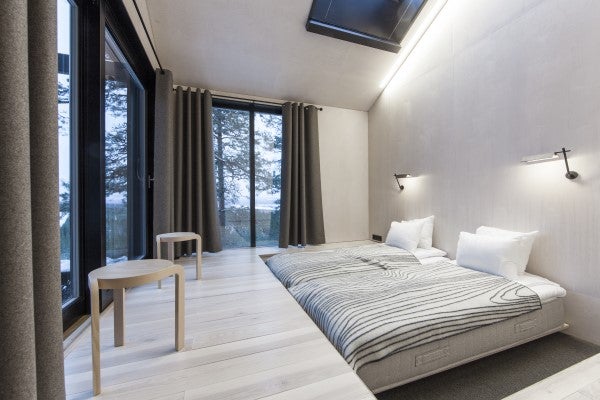There are also six more elevated cabins built on the tree-lined shore. Featuring a spiral staircase up to the loft room, these cabins have five beds, a bathroom and underfloor heating.