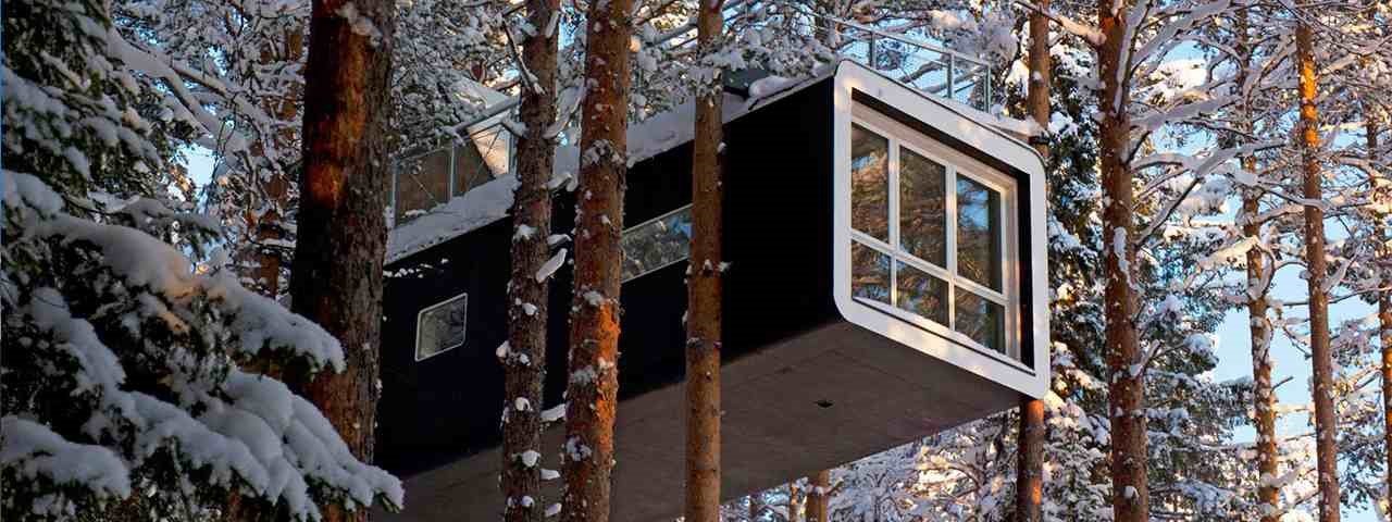 Located in a forest in Sweden, approximately 50km south of the Arctic Circle, the Treehotel takes the treehouse concept to the next level. Guests can choose between a nearly invisible cube camouflaged by mirrored walls, a seemingly hovering metallic UFO, a gigantic bird’s nest or a “Dragonfly” room – the Treehotel’s largest room with large panoramic windows framing a magnificent view of the valley.