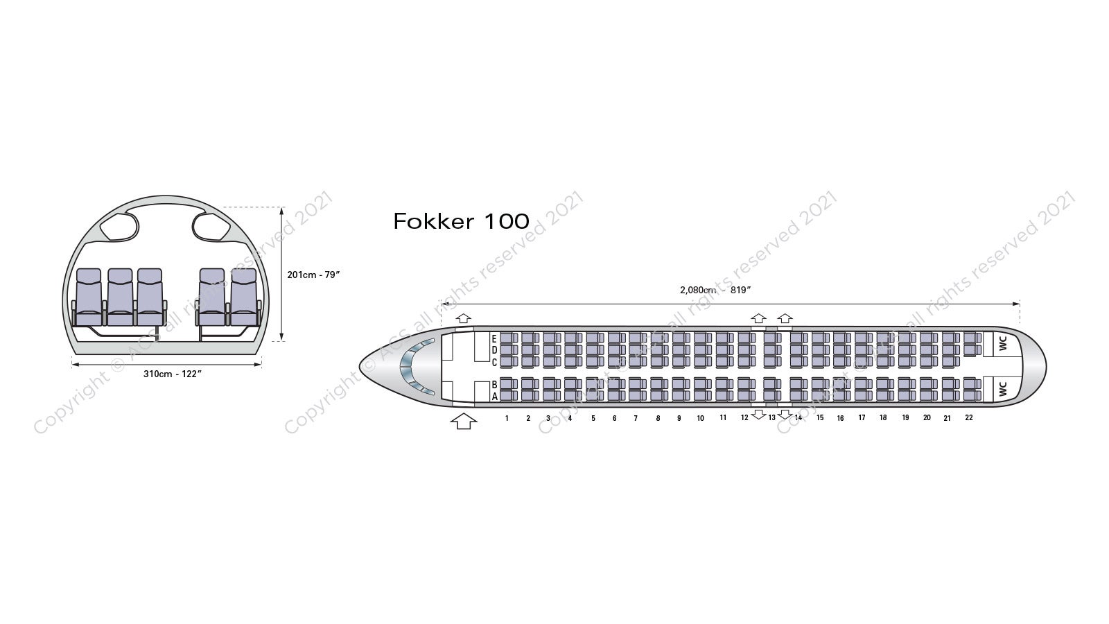 The Fokker 100 has a longer fuselage than earlier models, enabling a 65% increase in seating capacity. This has changed the seating arrangement from previous models to a three by two layout. Therefore utilising a single class configuration this aircraft can hold up to 109 passengers.