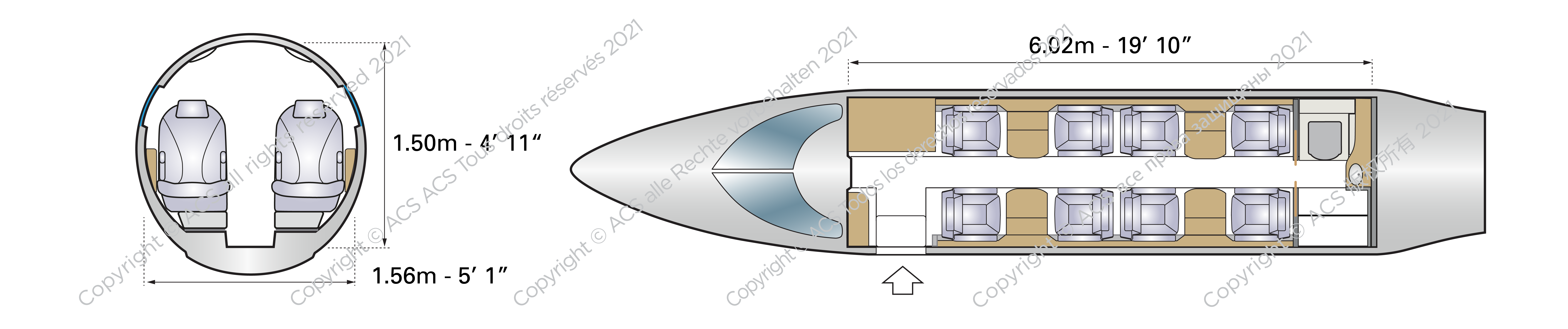 • The Learjet 45’s cabin is typically designed for eight passengers in a double club configuration. An extra passenger can be seated in the enclosed lavatory if required.