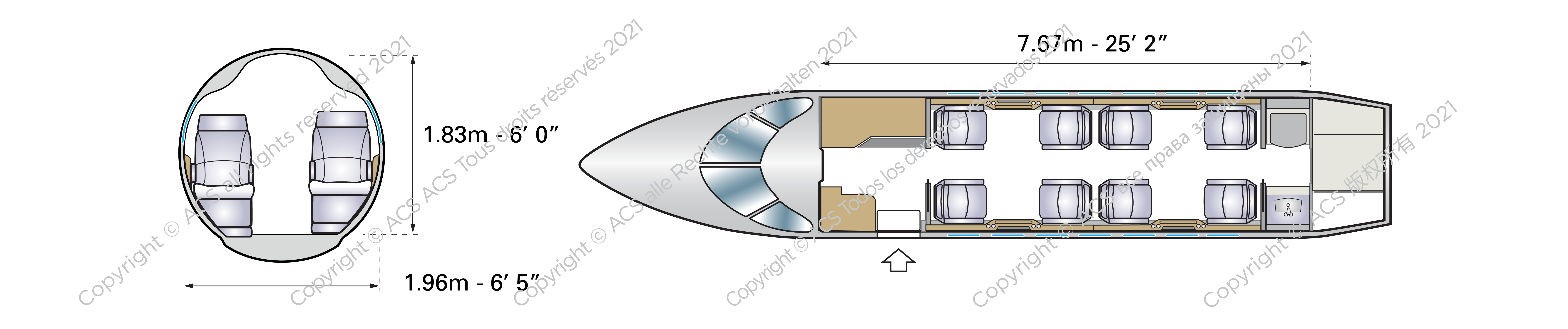 This super-midsize jet’s standard configuration features eight single seats in two club fours, with options for an additional side-facing seat in the front (with a smaller galley) or a couch replacing two of the aft seats. All interior designs have a wide, flat-floored cabin with a comfortable altitude of 5,950 feet whilst cruising at 45,000 feet.