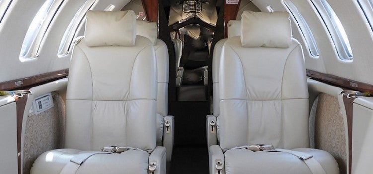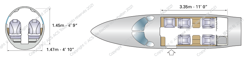 Below is the standard configuration inside a CJ1. Extra passengers can be seated in the cockpit and rear lavatory if required.