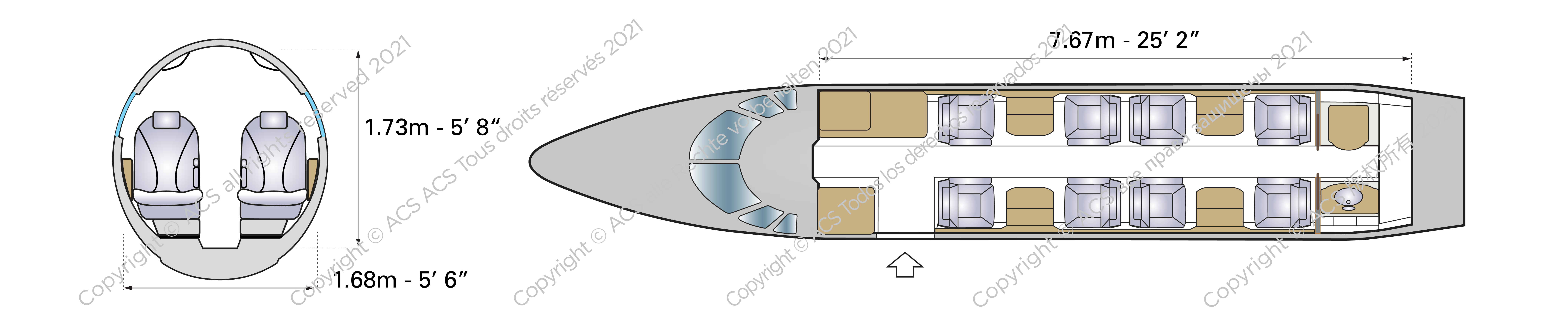 The Citation X’s luxurious cabin comes with a fully equipped galley at the front and a bathroom large enough to double as a dressing room at the rear. It typically seats eight passengers in a spacious executive layout, but can also carry up to 12 people in a higher-density seating arrangement if needed.