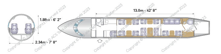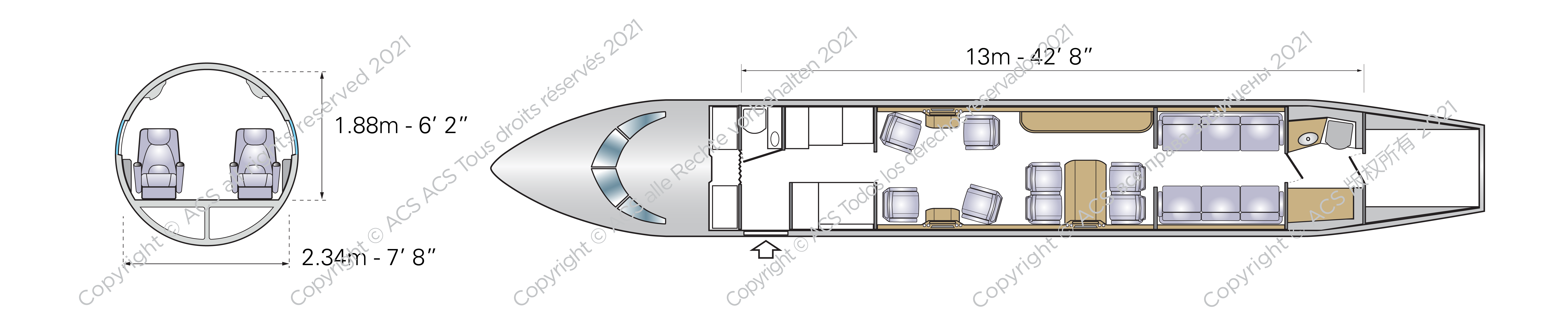 - A small enclosed lavatory at the front offers total privacy and separation between passengers and crew.