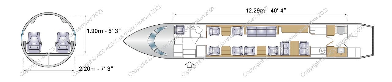 Customers who ordered the Gulfstream GIV-SP jet were able to completely customise the interiors, so there’s a variety of different configurations that feature four-seater conference areas, berthing divans and four-seater dining spaces. However, most of the jets have seating for up to 14 passengers, although the cabin can accommodate 19.