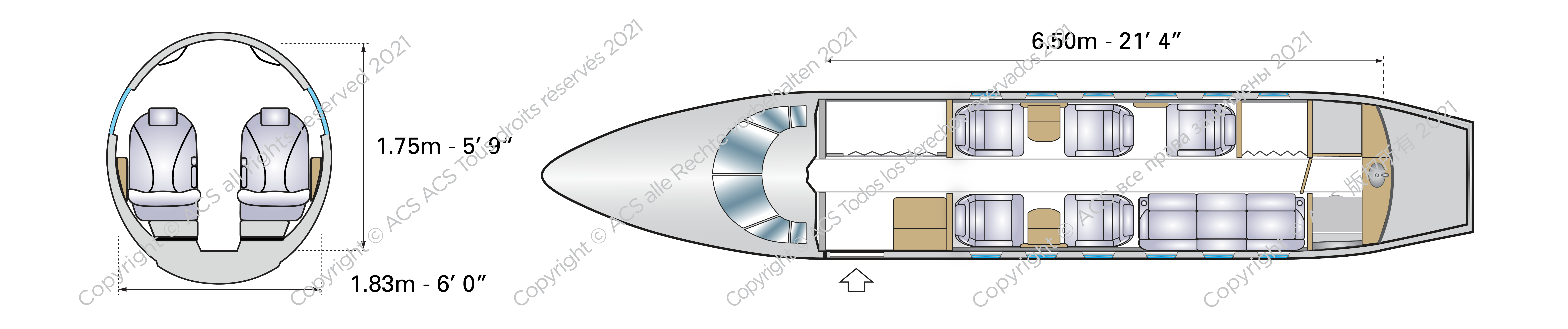 - Fully adjustable seats can swivel 360° and passengers enjoy stand-up headroom along the entire cabin length.