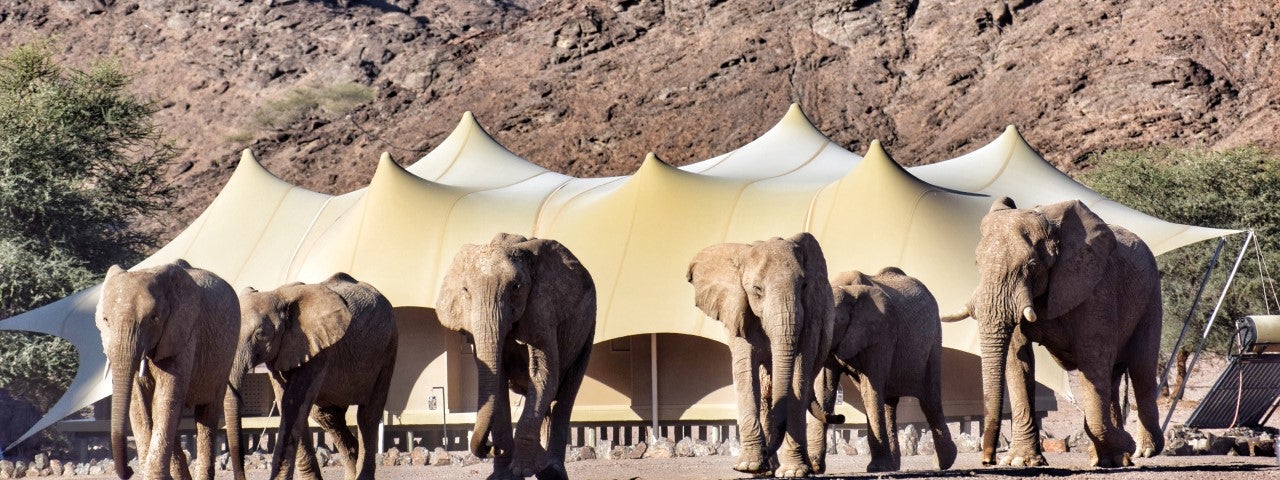 Hoanib Skeleton Coast’s eight luxury tented suites sit amidst the otherworldly landscape of Namibia's ancient Namib Desert, overlooking a rugged valley and the Hoanib River. Run entirely on solar power, this contemporary camp is renowned for its thrilling game excursions in search of desert-adapted wildlife like elephants, lions, hyenas and giraffes.