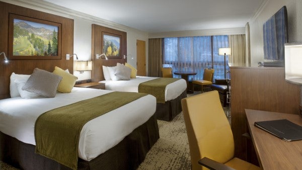 The Cliff Lodge boasts 350 air-conditioned guest rooms decorated with stylish wooden furnishings and earthy linens, all offering beautiful views of the slopes or canyon through wall-to-wall windows. Every room features two queen-size beds, an ensuite bathroom with marble vanity, a flat-screen television, and access to a ski locker with boot warmers. For larger parties of up to eight guests, units can be combined to create one- or two-bedroom suites.