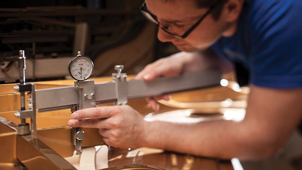 “We hand wind the strings on the grand piano and hand-notch the bridges,” Laul tells me. “This is the kind of craft you only get with high-end pianos.”