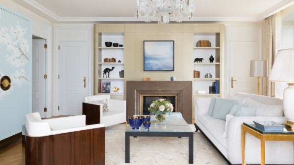 This is the only suite of its kind in the hotel, featuring a spacious living room with a fireplace and panoramic lake views on two sides. The walk-through dressing area, bedecked in dark lacquered wood, leads to a separate bathroom and bedroom with lake-facing balconies.