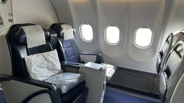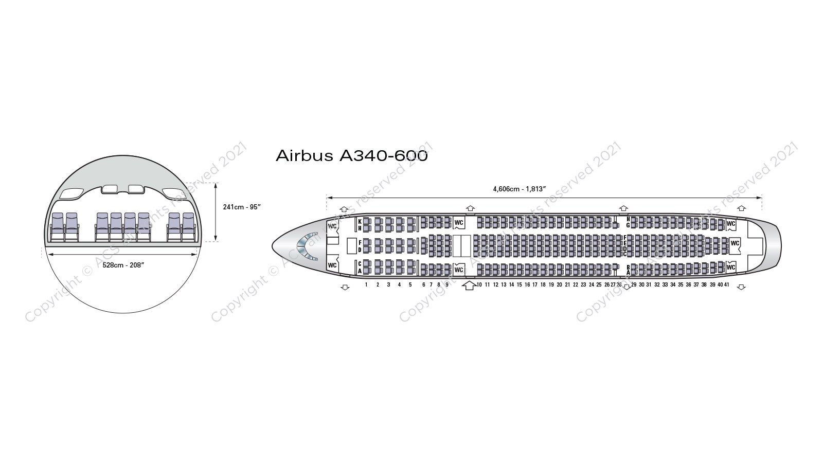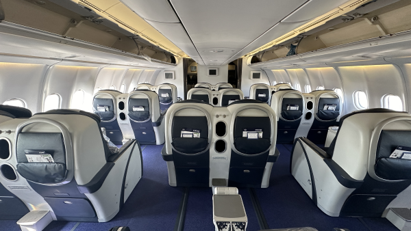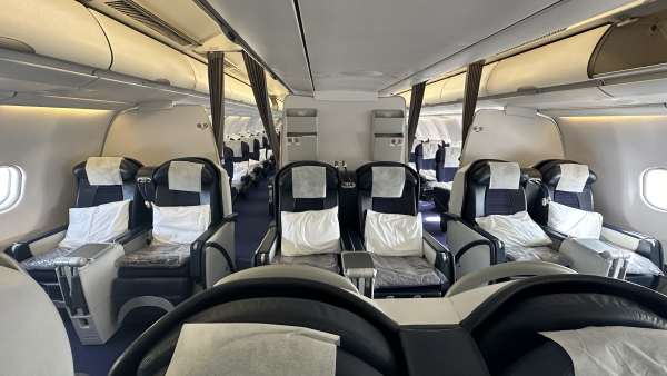 The A340-200/300/500/600 all have a quiet, aerodynamic cabin, with wider seats providing more personal space than competitors even in economy class. The -200 typically seats 261 passengers in a three-class configuration or 300 passengers in two classes, compared to 295 or 335 in the longer -300. Four-abreast first class and six-abreast business class layouts give passengers a guaranteed window or aisle seat.