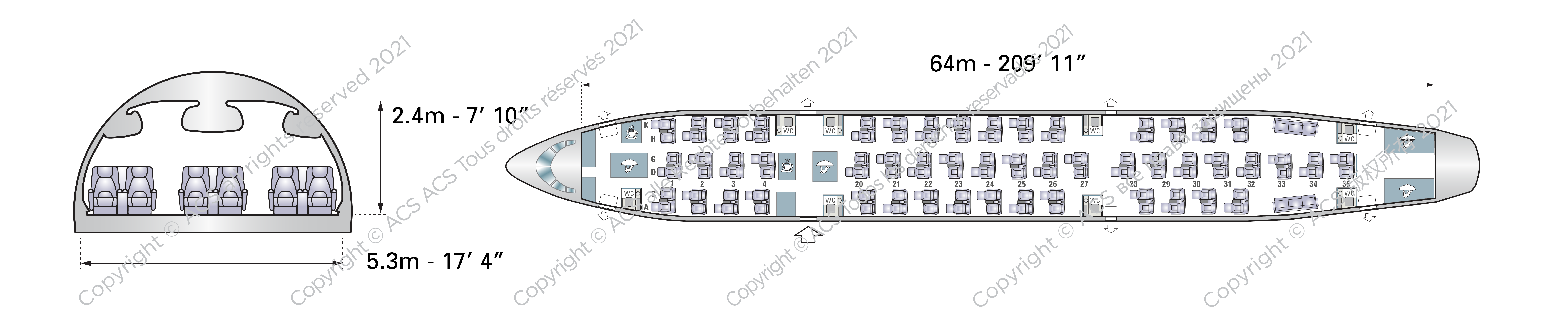 Both variants have flexible cabins that can incorporate a wide range of customised interiors, including modern in-flight entertainment and media centres. Onboard facilities are extensive, with up to nine fully enclosed lavatories and seven galleys for preparing food and beverages.
