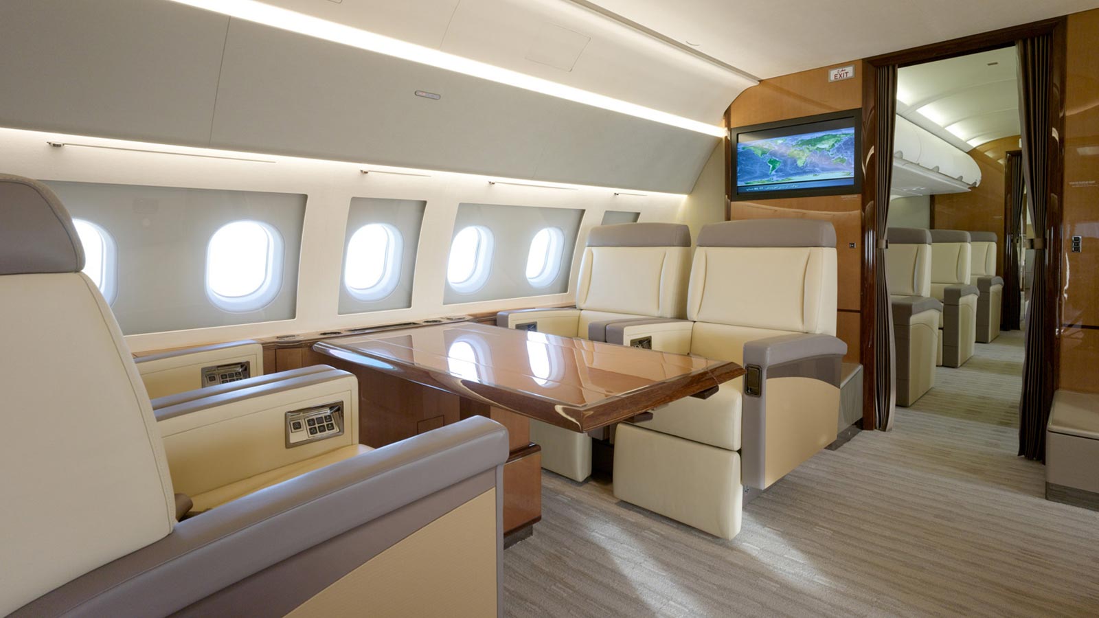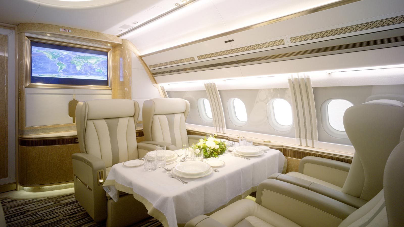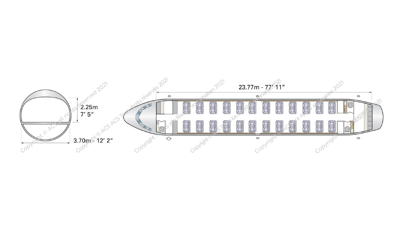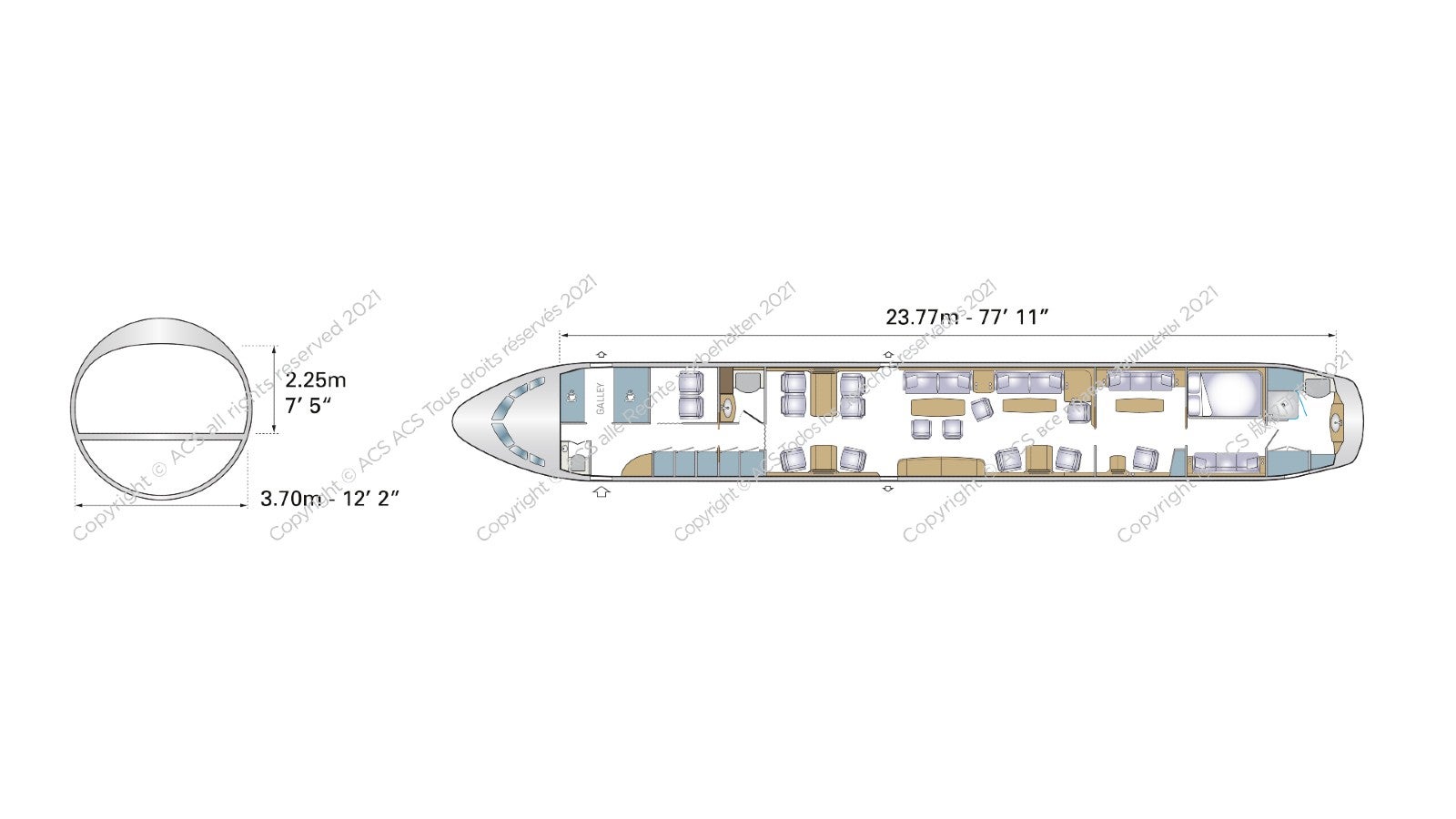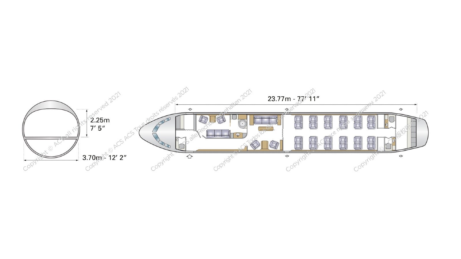A modification of the commercial airliner A319, the A319 CJ is slightly shorter in length, yet has a longer range. The corporate version is usually configured to hold up to 19 passengers, but exact interior configurations can vary greatly. This includes several other variations (illustrated below) which accommodate 29, 34 and 48 passengers. The corporate version cabin is generally divided into VIP quarters, complete with an office, bathroom with stand-up shower and bed, plus a high-density passenger seating area.