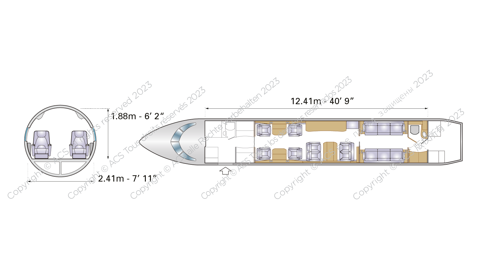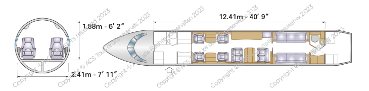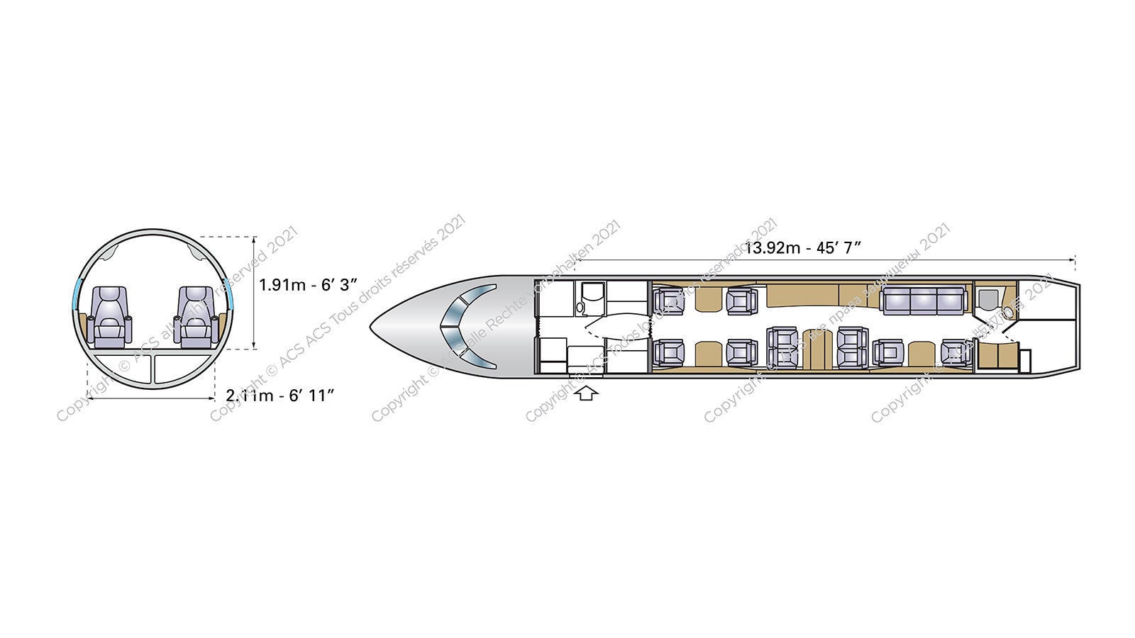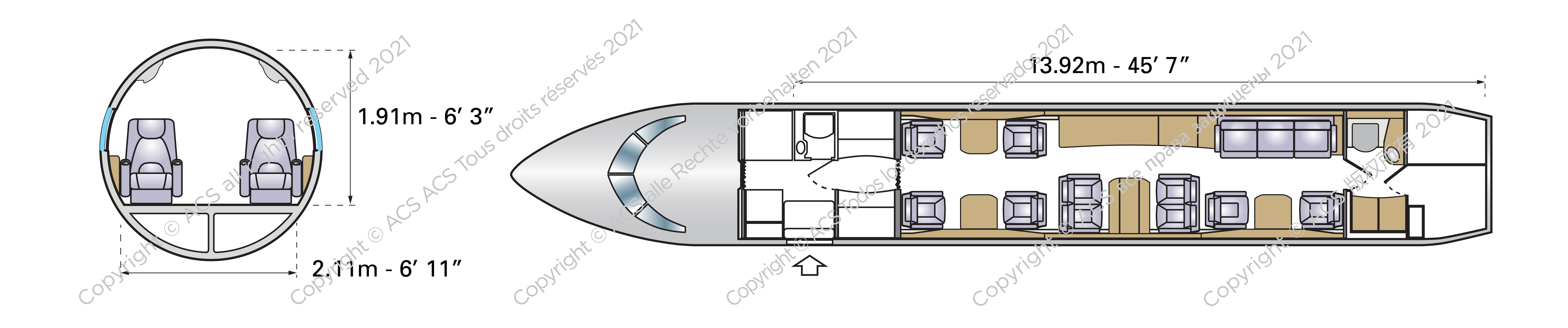 The main seating area has three sections: a four-chair club; a conference grouping on the left and credenza on the right in the mid-cabin; and a stateroom with two facing chairs on the left and a three-seater divan on the right. Some aircraft have been customised with three individual chairs in the mid-cabin and/or two three-seater divans towards the tail.
