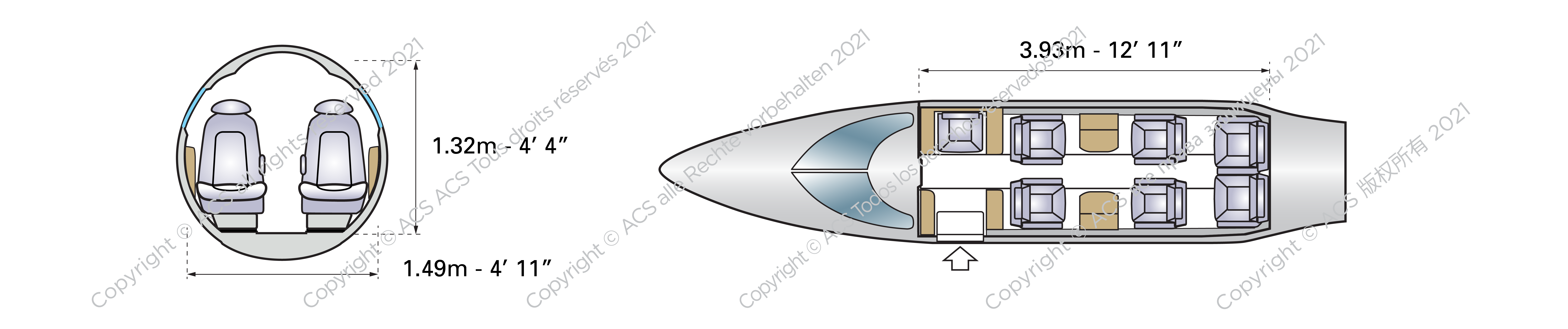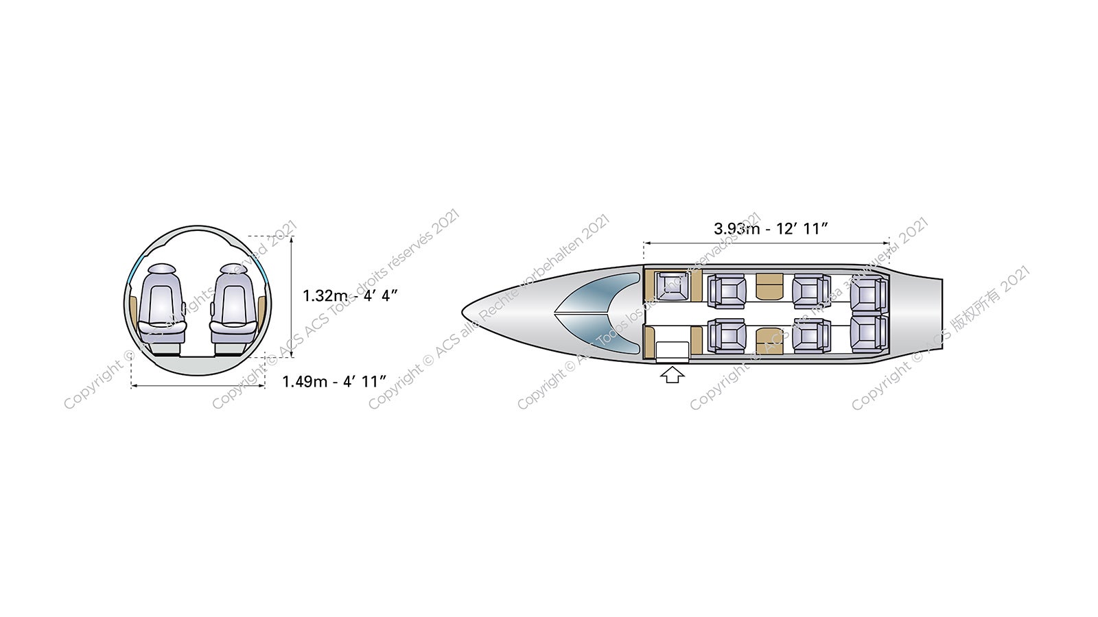 - While interior layouts vary, the aircraft typically seats seven passengers. A smaller eighth passenger (such as a child) can sit in the middle of the rear divan.