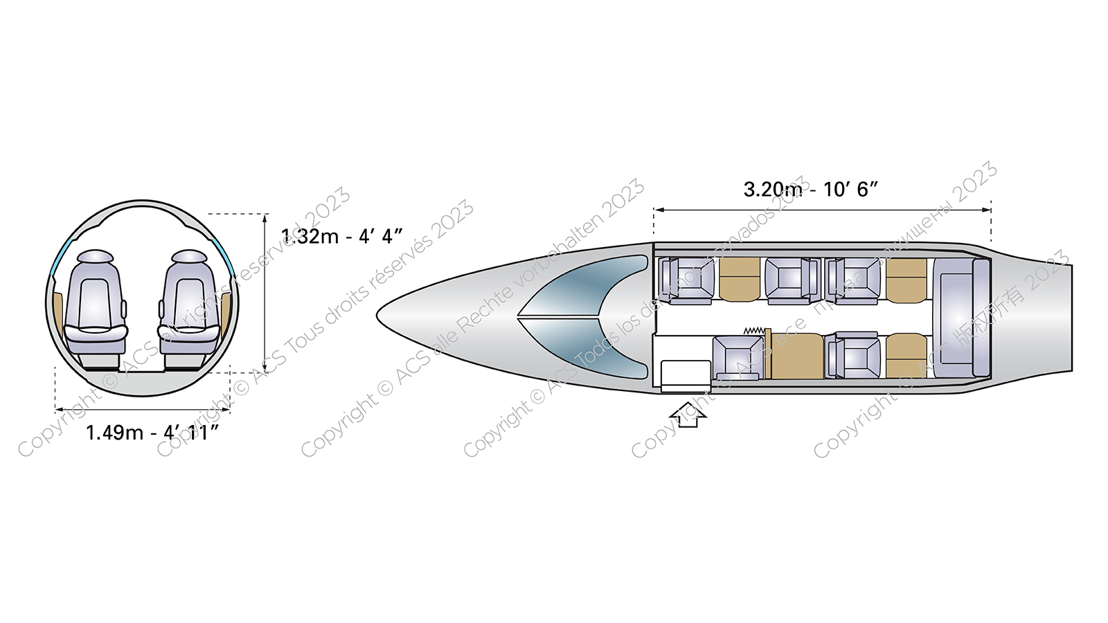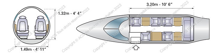 The Learjet 36 has a slightly shorter cabin than the 35, measuring 10ft 6in long, 4ft 11in wide and 4ft 4in tall. Designers sacrificed cabin capacity to allow for a larger fuselage fuel tank, with a maximum of six passengers instead of eight on the 35.