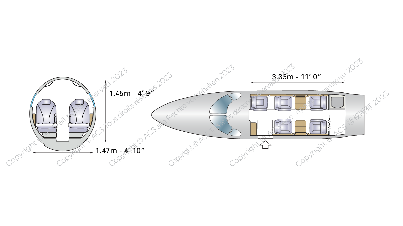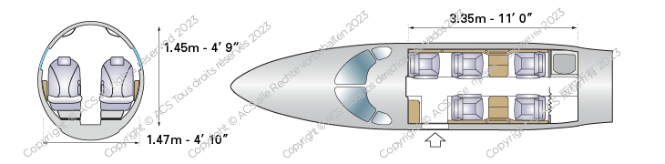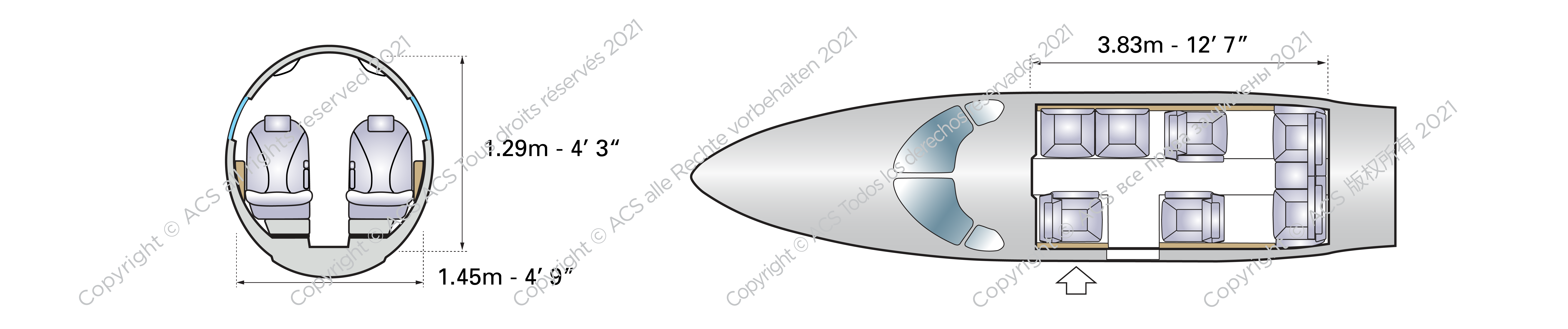 - Available layouts can accommodate five to seven passengers, with a further seat at the back if the aircraft is configured with an aft divan.