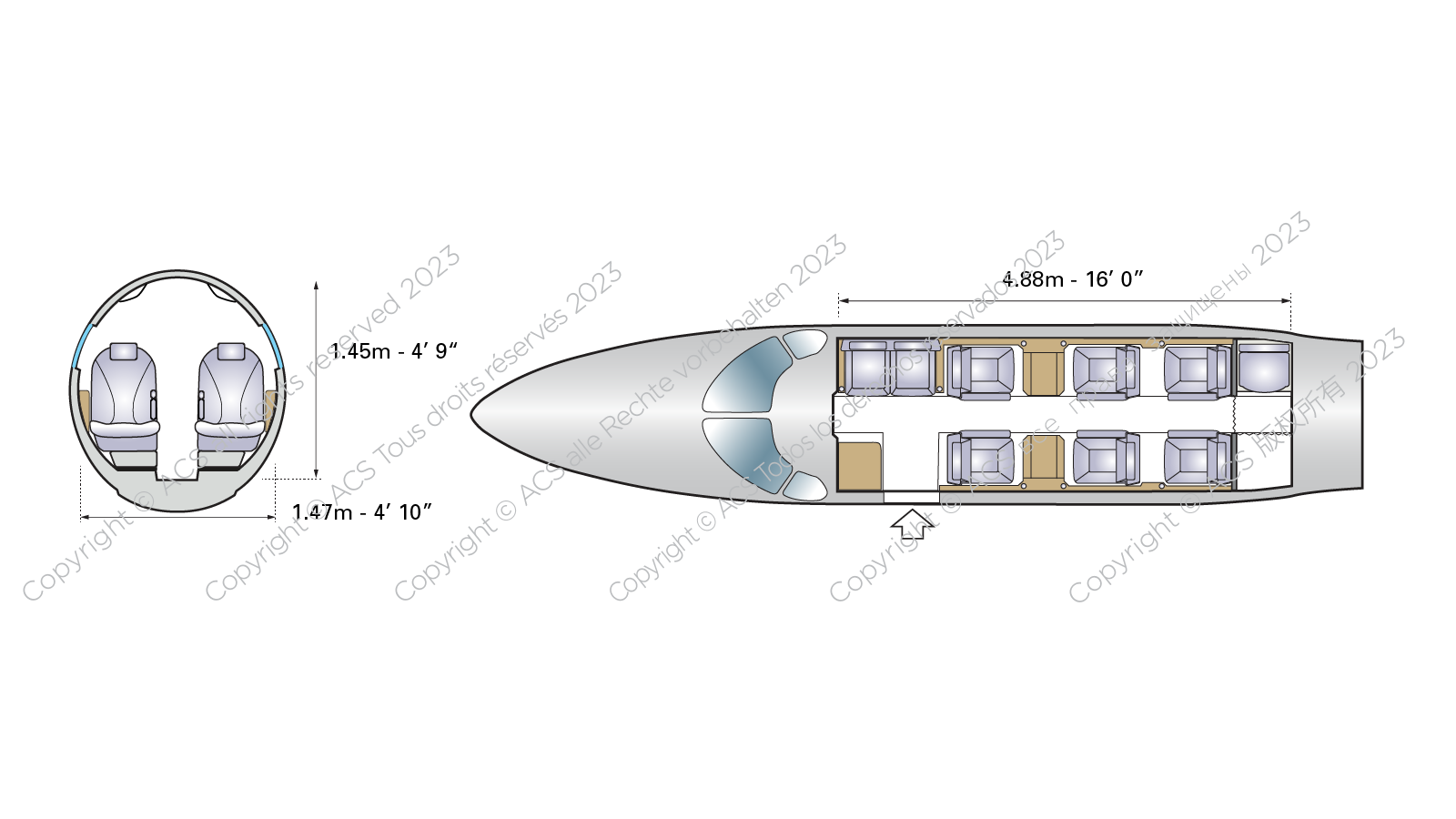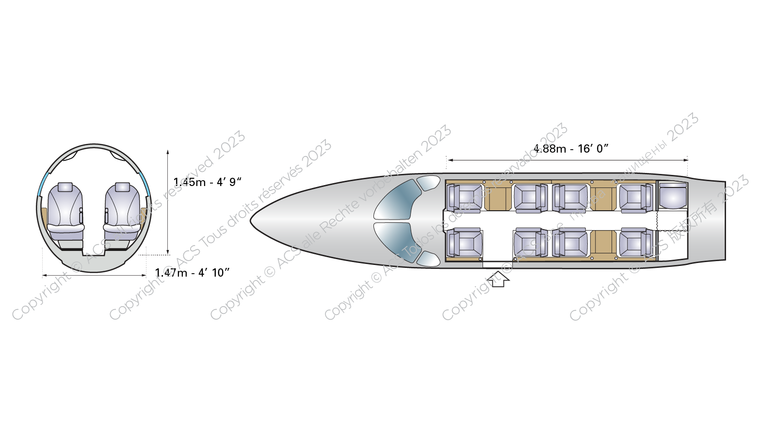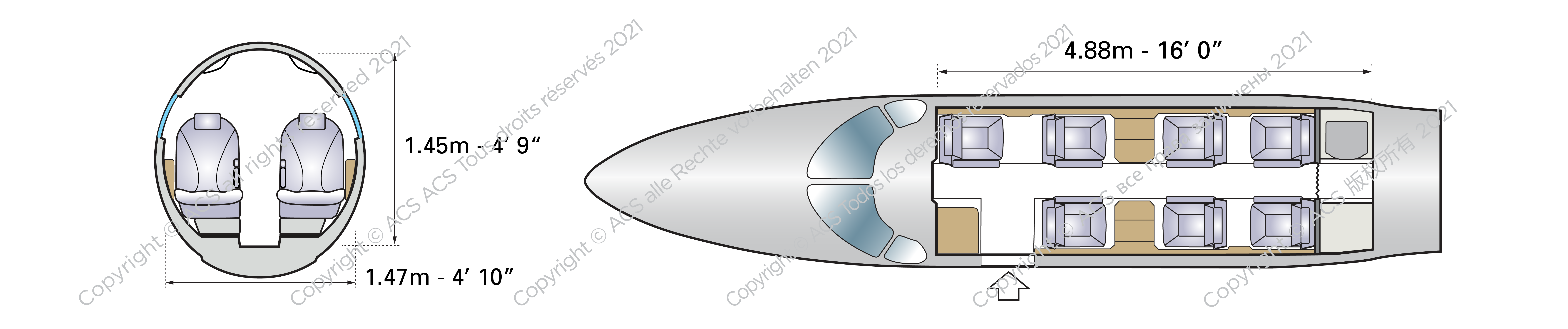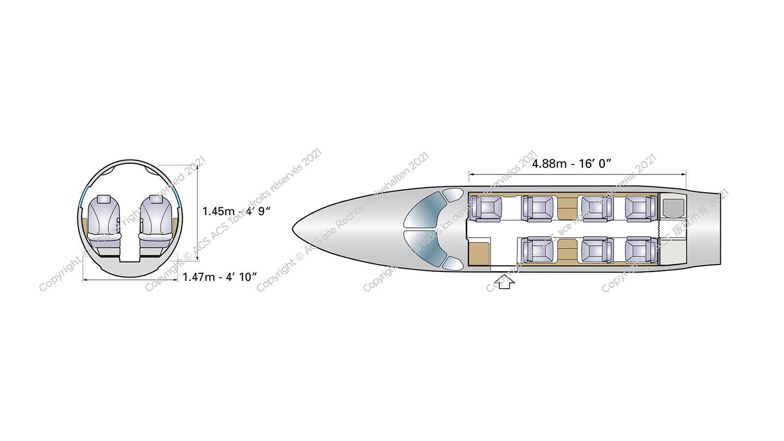 There’s also a rear enclosed lavatory and space for a small refreshment centre at the front. Natural light floods the cabin through 12 windows.