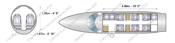 The cabin of the Cessna Citation II has many possible layouts. One of the most popular accommodates seven passengers, with four seats in a club formation, two forward-facing seats in the rear and one in the front facing the entrance.