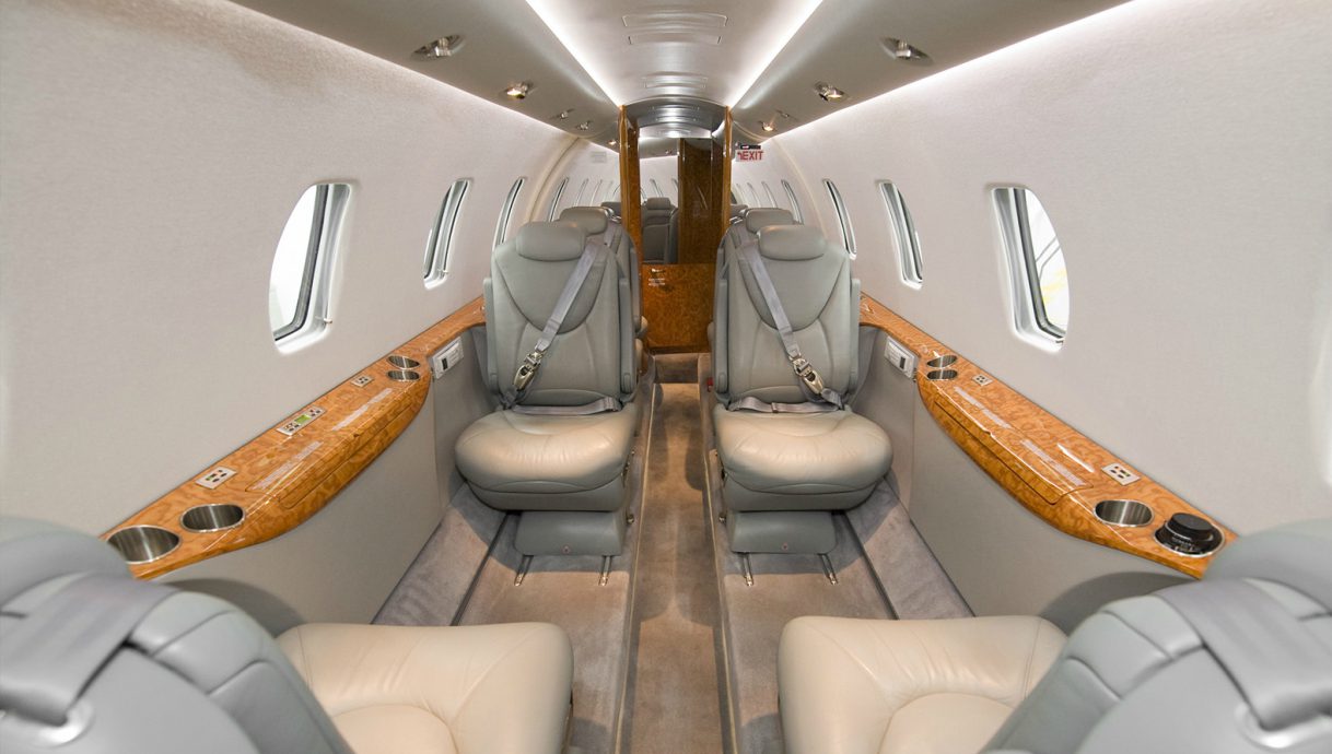 The jet is often configured to include a side-facing couch and has plenty of closet space for hanging suits and jackets. There’s a lavatory towards the rear and the galley usually has a microwave, wine caddy, ice drawer and hot liquid tank for preparing food and drink.