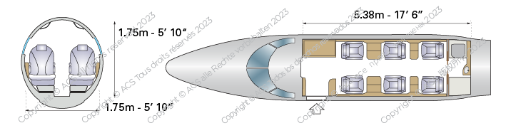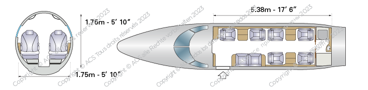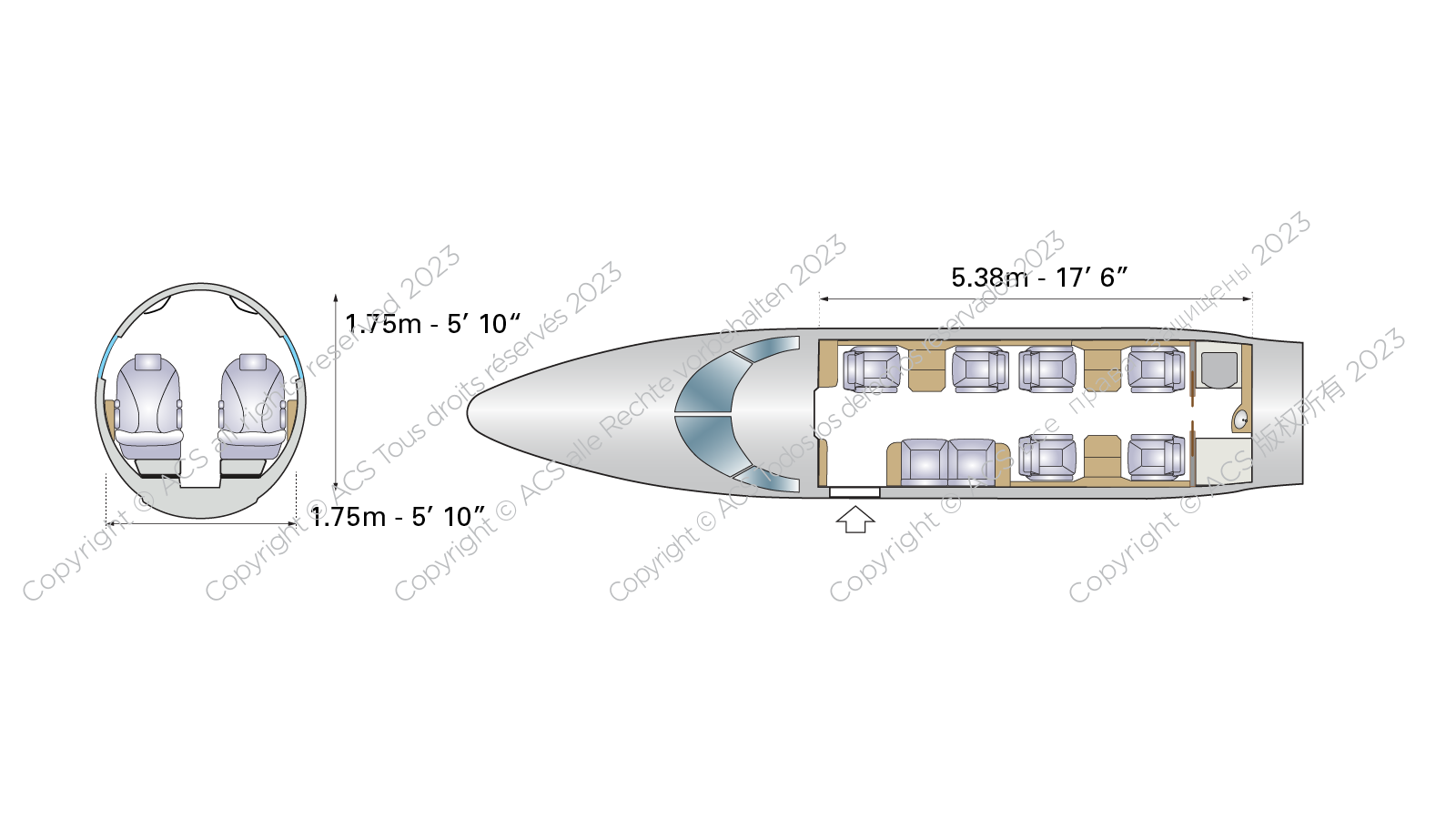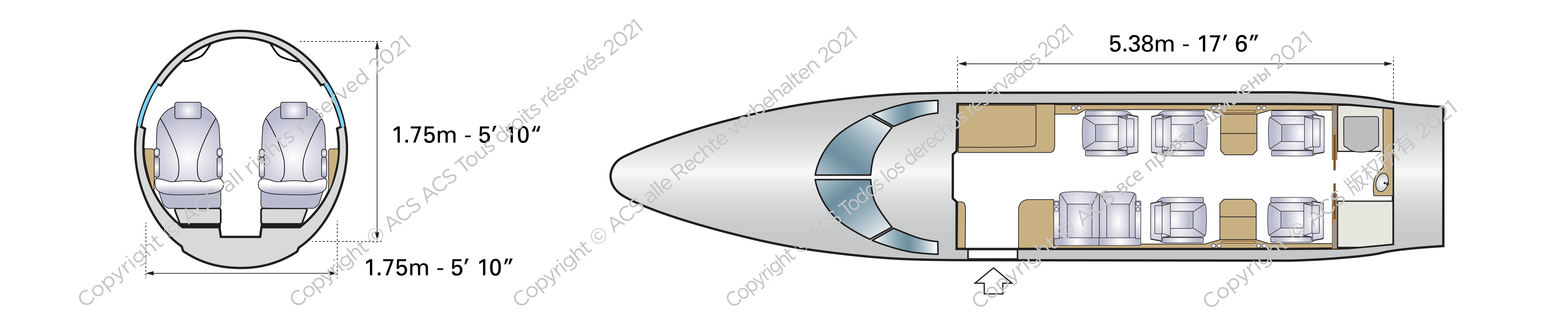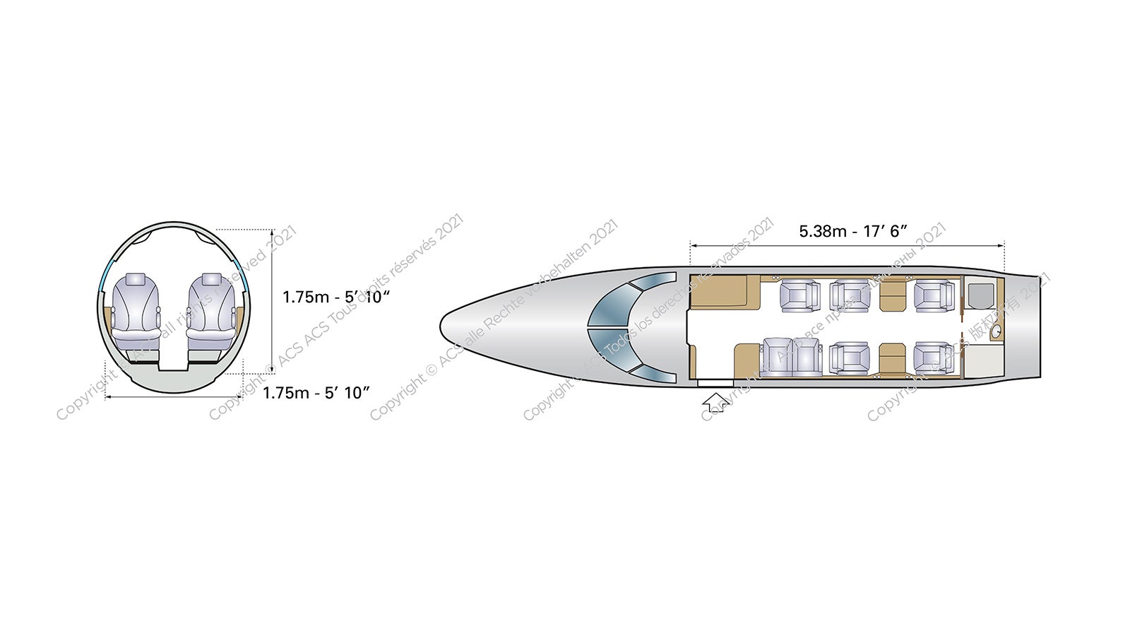 The rarer Hallmark layout can seat eight passengers, in what’s essentially the Universal with an extra chair in the aft section that limits the galley. All layouts can use the enclosed lavatory in the rear of the aircraft as an extra passenger seat if required.
