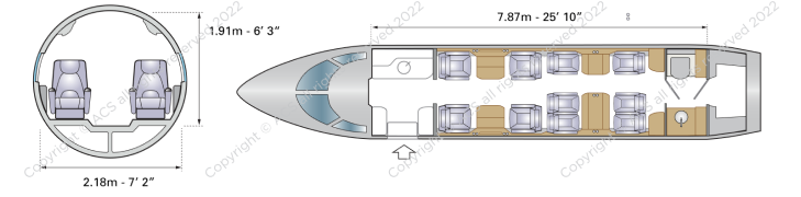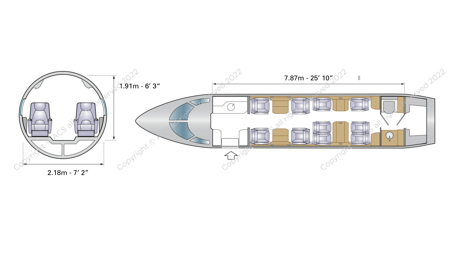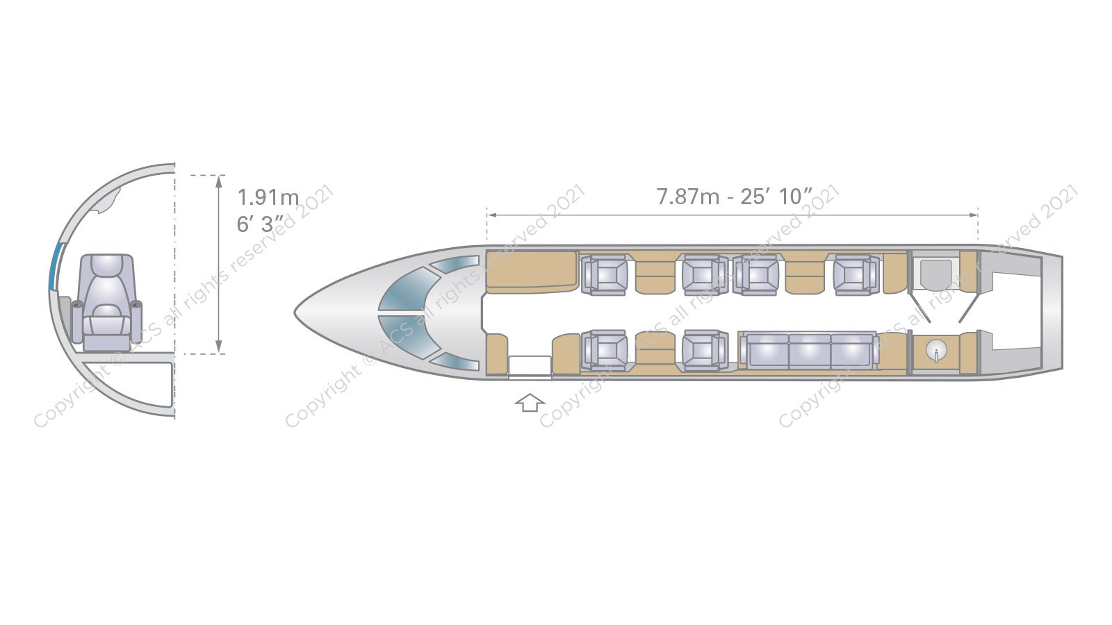 The spacious interior’s floor area is 17-35% larger than conventional jets, with a large galley and an enclosed lavatory at the rear. Nineteen panoramic windows let in plenty of natural light. There’s also a modern cabin management system on board.