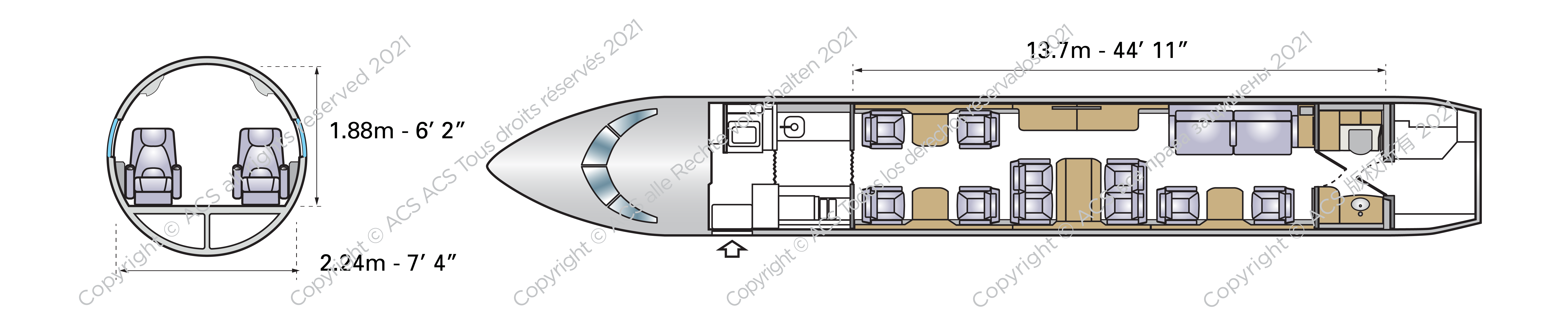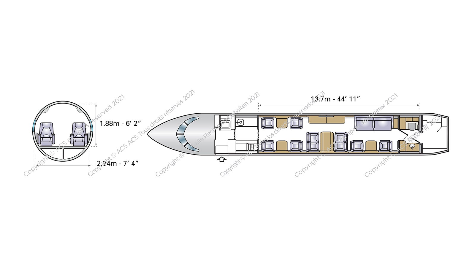 The G450’s spacious cabin can be configured to seat up to 16 passengers or sleep 6, but typically carries 14 on a mix of single and double leather seats and a four-person divan.