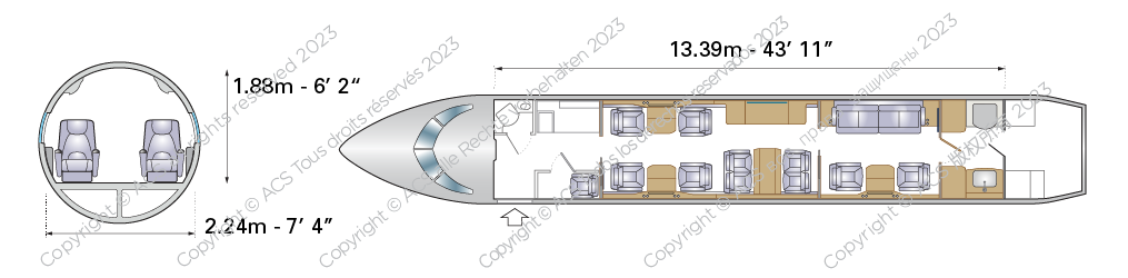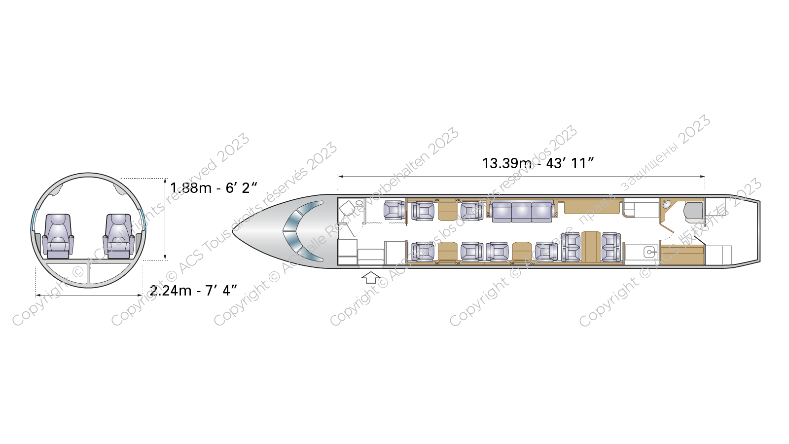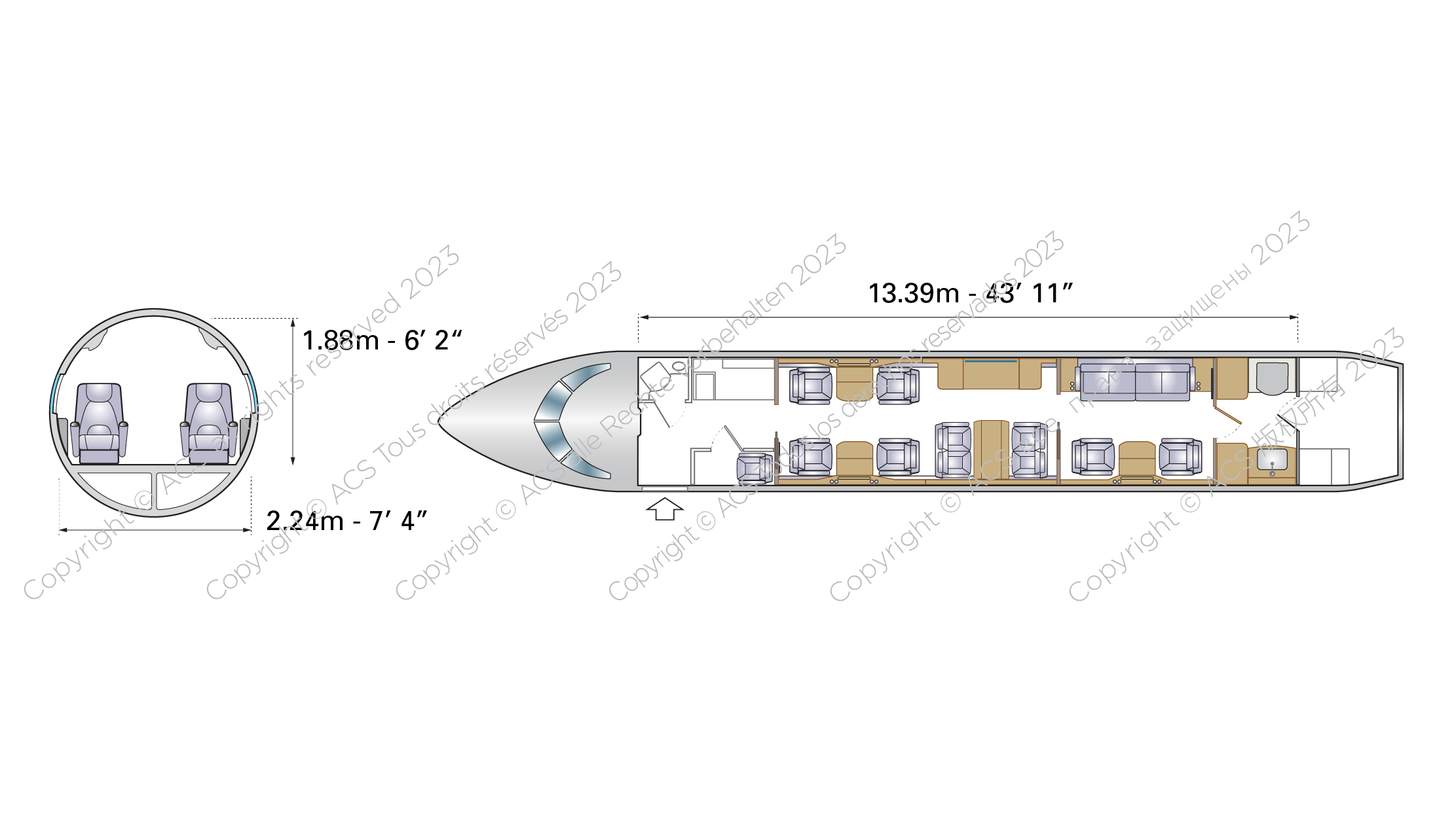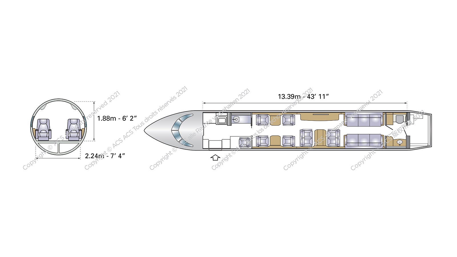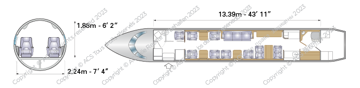 The “Elite” configuration includes a forward galley with dual coffee makers, microwave, and water sterilisation system (some have a rear galley instead). Newer models have upgraded chairs with a heated massage function and powered back- and leg-rests.