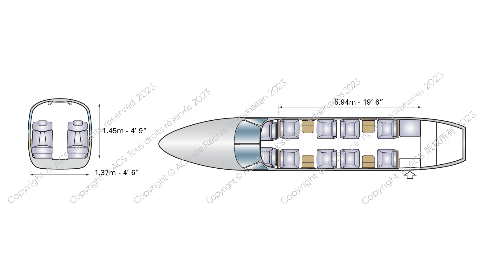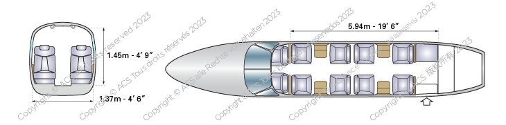 - The cabin is typically configured for eight passengers, with an additional seat in the semi-enclosed lavatory if needed.