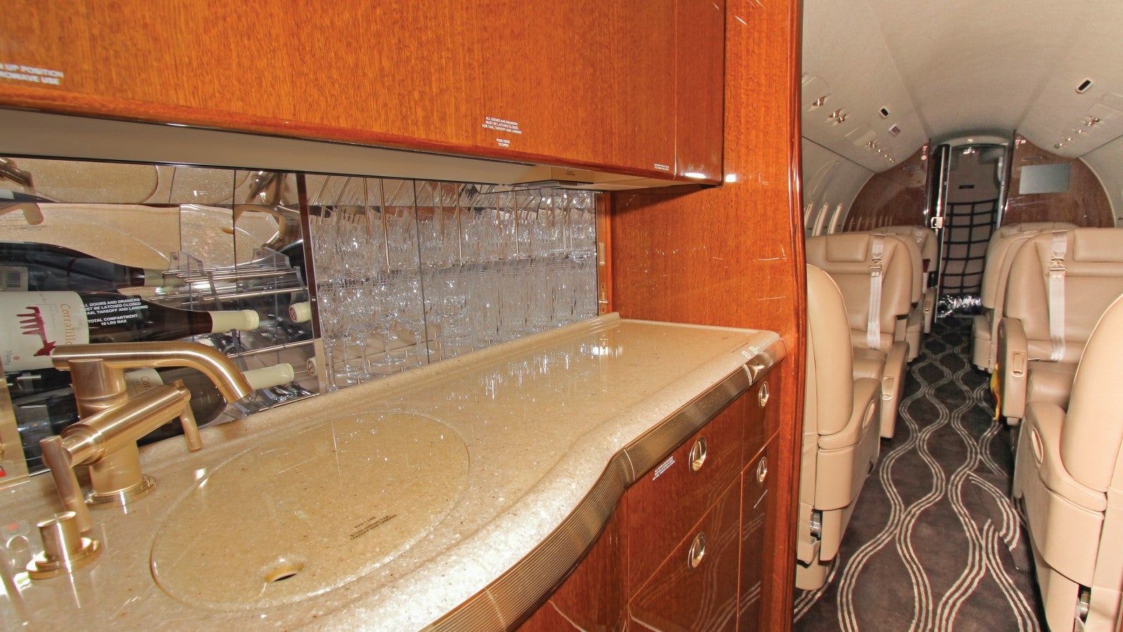 The Hawker 4000’s cabin is laid out either in a double-club configuration or with two seats swapped out for a three-seat divan in the rear. A forward cabin galley, two forward closets, and a rear lavatory with a walk-in baggage compartment complete the interior.
